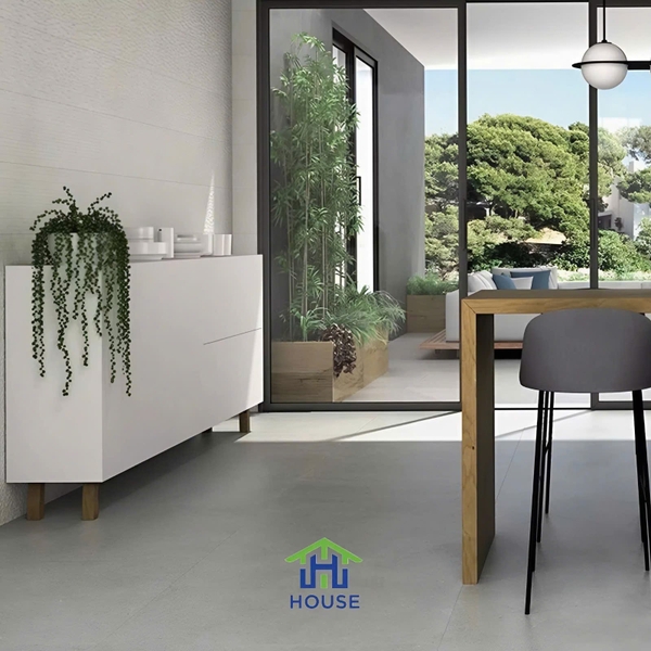 Gạch cement xám với bề mặt matt là nền tảng lý tưởng cho nội thất hiện đại. Sofa màu trung tính, bàn trà gỗ hoặc đèn thả kim loại sẽ nổi bật hơn trên nền ghi xám. Ánh sáng chiếu lên bề mặt matt tạo ra hiệu ứng ánh sáng nhẹ, giúp không gian trở nên có chiều sâu và ấm cúng hơn.